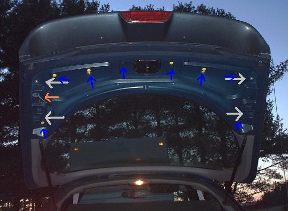 The SILVER ARROWS Point to the Bolt locations for the spoiler The BLUE ARROWS point to where the plastic molding is attached to the body by yellow pins. The ORANGE ARROW points to the electrical connection for 3rd brake light What you will need.... Flathead screwdriver, socket set, hexhead screwdriver, electrical tape, and a coat hanger Total Cost: $$$ Varies *You can purchase this Wings West Spoiler directly for $400 plus s&h* |